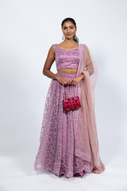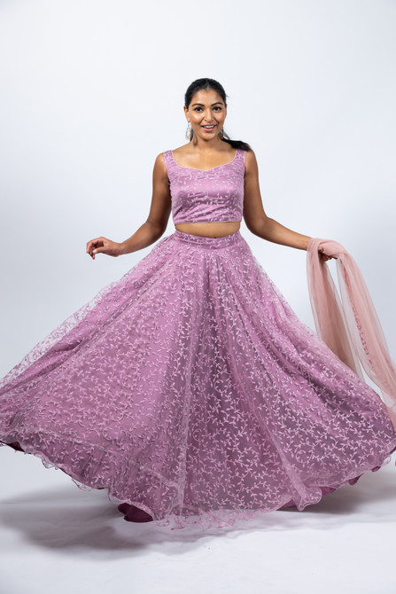 Ethereal. This elegant lehenga set is embellished with all over inticate floal embroidery. Paired with sleeveless blouse and a soft net dupatta. Comes with attachable sleeves. This lehenga set is available in three sizes: small, medium, and large. Refer to our size guide for more details. Our skirts are stitched to fit sizes S-L through adjustable tie or elastic at the back. Please refer to the size guide.