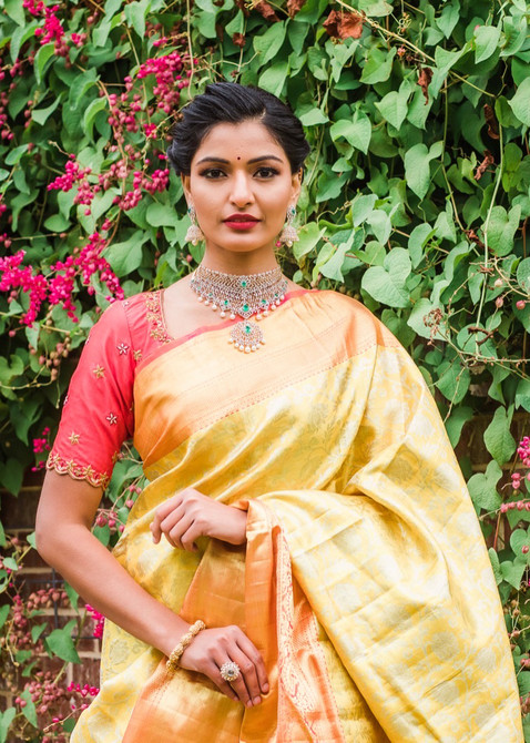 A pure silk saree in Yellow with gradient border in Peach color culminates in rich traditional pallu. Comes with a tastefully designed embroided blouse.