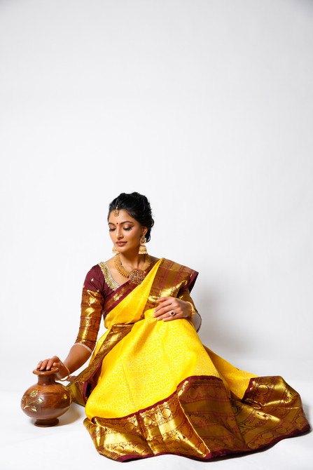 Straight from the 'City of Thousand Temples' - Kanchipuram, this saree is a fusion of geometric design in the body and traditional korvai border executed to perfection. The border design is inspired by 'Chakras' and animal sculptures from the temples in Kanchipuram. We love this rare combination of Yellow - deep Wine color, which almost looks like dark chocolate. This comes with a beautiful hand embroided blouse.
