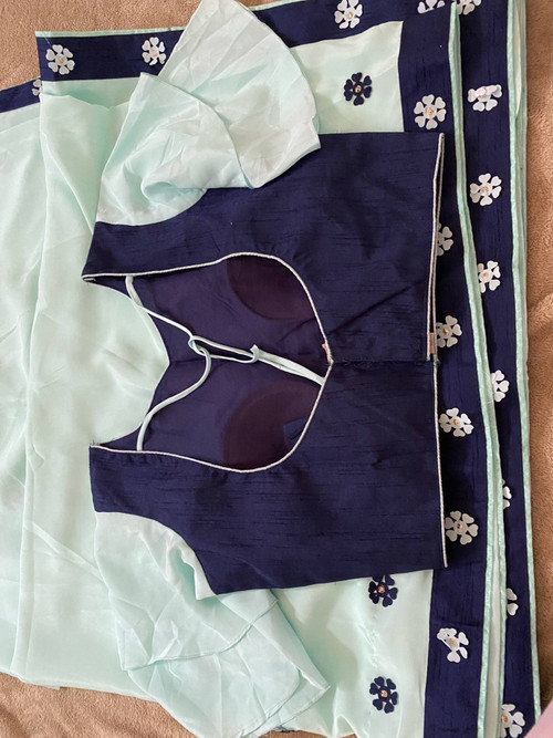 Soft Satin saree featuring patch work and cute borders. Comes with a fun ruffled sleeve blouse.